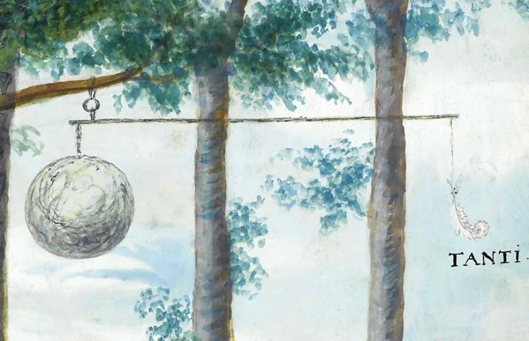 “What is the noble lord thinking about?” – the aforementioned AV asks further. Stepanov gives the following answer: “The prospect leads our eyes upwards, where, against the bright sky, a balancer is suspended from a tree b (Fig. 5 – A. ), which could take a place in the treatise of French mechanic Jacques Besson“ Theater of Mathematical and Mechanical Instruments ” (1587) as a parody of the rule of the lever: a moon globe hangs on a short shoulder, a writing pen is hung to a long arm, under which stands the Latin word “tanti” (“equivalent”).