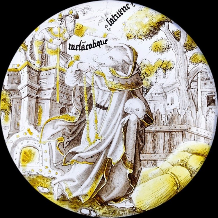 Fig. 7. Time (in the form of an old man-Saturn) expels Melancholy. Stained glass from Flanders, subsidized approximately 1530 year. Victoria and Albert Museum, London