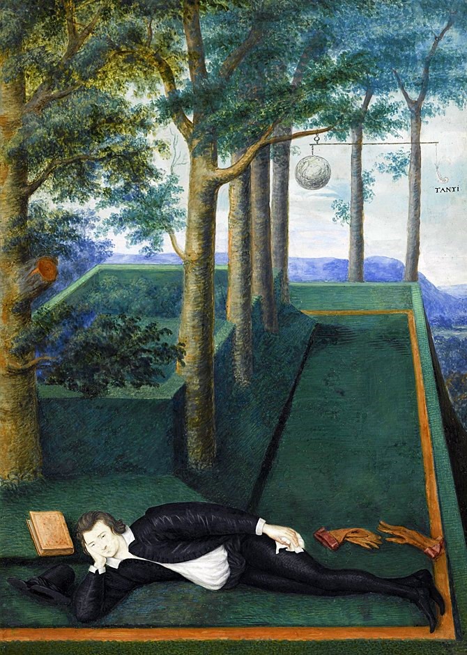 [Warlock], who undoubtedly belongs to the secret design of the portrait, executed by Hilliard … ordered to portray himself lying on a rectangular stepped terrace, raised above the valley, like a tall island above the sea. Here grow trees planted along a ruler, closing up at the top with their dense crowns. The valley and the distant mountains are sunlit. At the top of the terrace, closest to the sun, dark. Count Henry prostrated himself on the ground across the entire width of the portrait, melancholically supporting his head with his hand. The black coat is unbuttoned, the white shirt apache glitters with carelessly tucked into the belt.