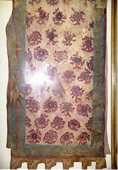 It is kept in the Hermitage. The Ukok Plateau is located in the permafrost zone, which ensured good preservation of the carpet and other artifacts of the burial mound. “The decoration of the carpet is rich and diverse motifs. The central field is occupied by an ornament of 24 cruciform shapes, each of which consists of 4 schematized lotus buds. This composition is framed by a curb with an image of eagle griffins, then there is a curb with 24 figures of grazing spotted fallow deer with characteristic broad-banded horns.
