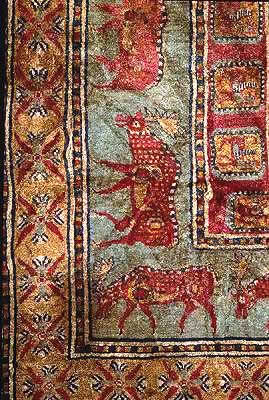 It is kept in the Hermitage. The Ukok Plateau is located in the permafrost zone, which ensured good preservation of the carpet and other artifacts of the burial mound. “The decoration of the carpet is rich and diverse motifs. The central field is occupied by an ornament of 24 cruciform shapes, each of which consists of 4 schematized lotus buds. This composition is framed by a curb with an image of eagle griffins, then there is a curb with 24 figures of grazing spotted fallow deer with characteristic broad-banded horns.