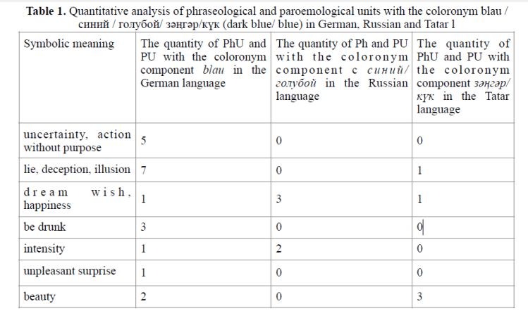 Table 1. Quantitative analysis of phraseological and paroemological units with the coloronym blau /
