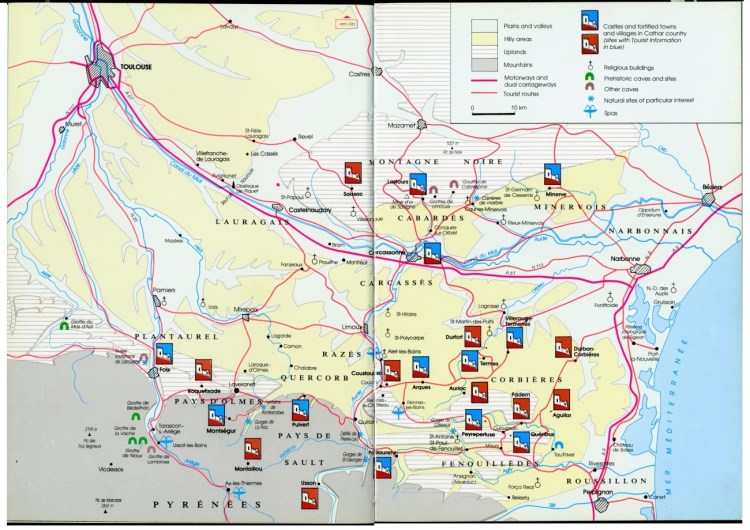 The four main Cathar dioceses in Southern France were Agen, Albi, Carcassonne and Toulouse and the main castles were at Carcassonne, Montsegur, Queribus, Puylaurens, Roquefixade, Peyrepertuse, Termes and Puivert. This whole area of France is known as the Languedoc or Roussillon