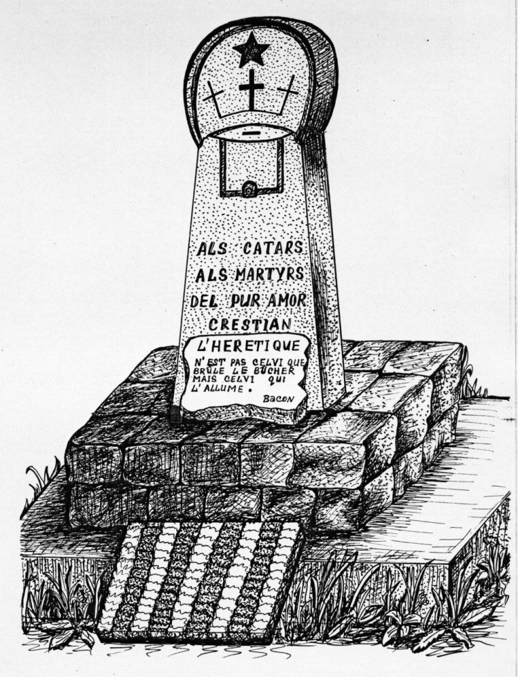 Drawing of the monument at the mountain where Montsegur Fortress stands ruined