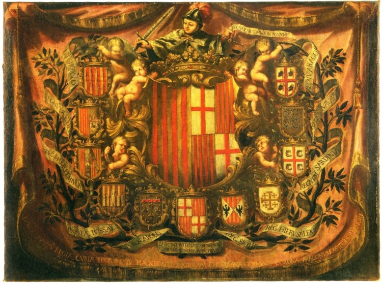 Arms of Catalonia (listing Valencia, Naples, Sicily, Jerusalem, Sardinia, Navarre, Aragon)