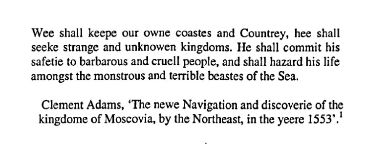 His book followed the 1586 publication of Albion’s England which studied the inception, progression and activities of the newly formed Muscovy Company and it’s recent (1553) DISCOVERY of Russia….’a Barbaric land on Christendom’s border.’ (No comment)