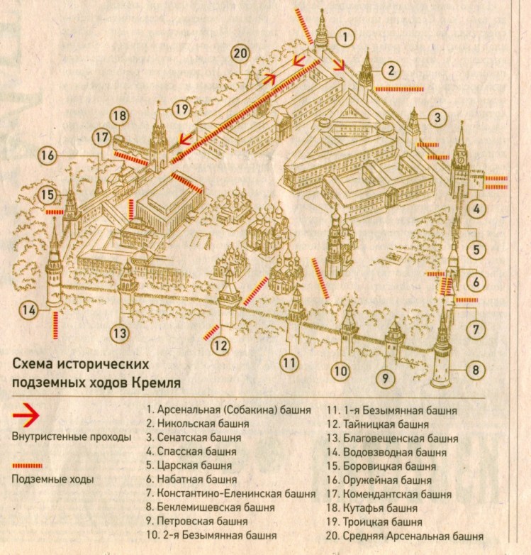 “Official Gazette” of February 24, 1912 wrote: “ancient underground tunnels in Moscow image of the whole network, not only has been investigated so far discovered underground tunnels between the Novodevichy Convent and the manufacturing factory of Albert Gunther, under the Donskoy Monastery, Golitsyn Hospital and Neskuchny garden is well researched.. the underground passage under the Borovitskaya Tower, in which two niches were found, opening tunnels to the center of the Kremlin and under Ilyinka. The underground tunnels also have the Taynitskaya, Arsenalnaya and Sukharev towers. apparently separate from the general network. “
