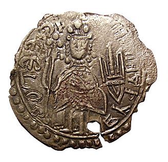Vladimir’s effigy on one of his coins. He is crowned in the Byzantine style, holding a cross-mounted staff in one hand and holding a Khazar-inspired trident in the other.