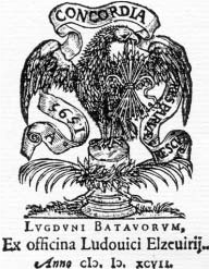 4) Publisher’s sigil of Lodevic Elsevir. The date, allegedly 1597, is written as {(I).I).XCVII.}, – with separating dots, as well as crescents facing left and right used for Latin letters “M” and “D”, fig. 6.66. This is a very interesting example, because the left band also has a recording of the date in “Arabic” digits.