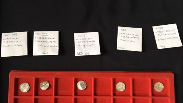 Image copyright GETTY IMAGESThe coins, which date from just after the Battle of Hastings in 1066, depict both the defeated King Harold II and the triumphant William the Conqueror.