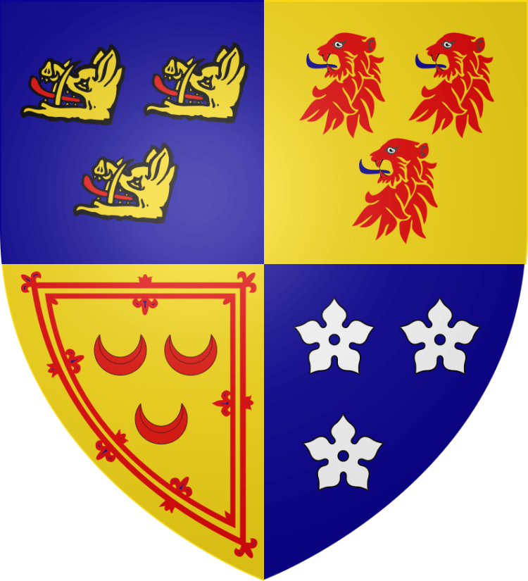 coat of arms of the Marquess of Huntly, Chief of Clan Gordon Blazon: Quarterly 1st Azure three boar’s heads couped Or langued Gules (Gordon) 2nd Or three lion’s heads erased Gules langued Azure (Lordship of Badenoch) 3rd Or 3 crescents within a double tressure flory counter-flory Gules (Seton) 4th Azure three fraises Argent (Fraser).