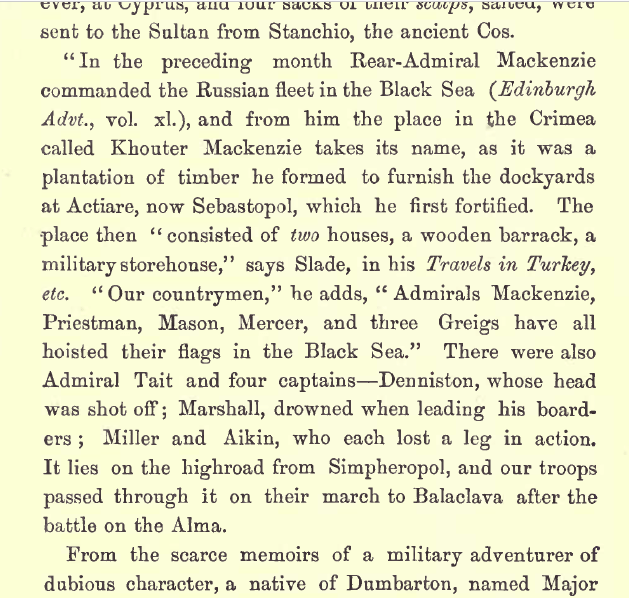 Khouter MacKenzie, in the Crimea, is so named from Admiral MacKenzie, who. commanded the Black Sea fleet under Katherine II, and fortified Sebastopol. In 1738 MacKenzie of Conansby was a colonel under the Empress Anne, and Captain MacKenzie of Redcastle, another officer in the Russian service in 1784, was killed in a duel near Constantinople.