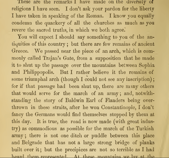 She’s travelled from England. She will get to Constantinople soon. At the moment she is writing about Trajan’s Gate.