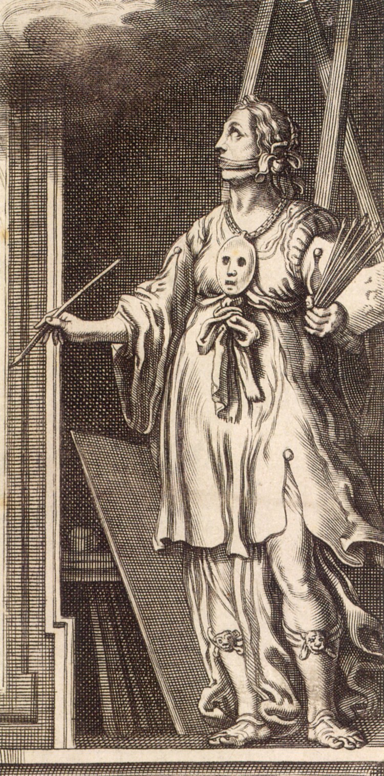 WOMAN, beautiful, with black hair, and thick, scattered, and twisted in various ways, with arched eyelashes, showing fantastic thoughts; cover the mouth with a band tied behind the ears, with a gold chain around the neck, from which a Mask hangs, and has Imitatio written on the forehead. She will hold the Brush in one hand, and in the other the panel, with the iridescent cloth covering her feet, and at the foot of it some instructors of Painting can be made, to show that Painting is a noble exercise. , not being able to do without much application of the intellect, from which application all the professions of any kind are caused, and measured near us (not doing the works done at random, although very perfect to the praise of the Author, otherwise ,than if they weren’t his). This very beautiful image is painted, and, if the beauty is aware of nobility, it is seen, because: the one, and the other is perfection, and the one, and the other is worthy of Empire; and according to Homero’s saying they both like, and delight, move, and fall in love, but the one, which is corporal, primarily the senses, the other, which is intelligible to the intellect; on the contrary, they are not even similar, but they are reputed by many Philosophers, and it is commonly believed that where there are beautiful qualities of the body there are mostly those of the soul, and where there is beauty there is nobility. The hair of the head becomes black, and thick, because being the good Painter in constant thoughts of the imitation of nature, or of art, as it gives perspective, and is the object of the eye,and for this, since he needs almost continuously to have all the visible effects of nature for his imagination, he comes for this reason to take great care, and maninconia, which then generates addiction, as the Medici say, from which naturally in men with many others this particular accident occurs. Hair will be hirsuti, and scattered overhead, and in different parts, with rings, which appear to be produced by neglect, because these arise outwardly from the head, as thoughts are born inside, and ghosts, which are means as to speculation, so again to material works. The arched eyelashes show wonder. And truly the Painter extends himself to such a subtle investigation of minimal things in themselves with the help of his art, that he easily acquires wonder and maninconia.The covered Mouth is indicium, which is not a thing, which is as useful as silence and solitude; however, the Painters are kept in secret places, not because they fear reproof of the imperfect work, as is commonly estimated. He holds the Golden Chain, from which the Mask hangs, to show, that the Imitation is inseparably linked with the Painting. The Anelletti della Catena show the conformity of one thing, with the other, and the conjunction, because not everything, as Cicero says in his Rhetoric, the Painter learns from the Master, but with only one he learns many, coming for conformity , and simile joined, and chained together. The quality of the Gold demonstrates that when the painting is not maintained by the nobility it is easily lost, and the mask shows the appropriate imitation to the painting. The ancients demanded Imitatione that discourse which, although false, was made with the guidance of some truth that had happened, and because they wanted that those Poets, who lacked that part, were not reputed Poets, so the Painters are not to be imitated, who they have not, since that trivial saying is true, that Poetry is silent in Painting, and Painting in Poetry reasons; it is true that they are different in the way of imitating, proceeding by opposition, because the visible accidents, which the Poet makes almost visible with his intellect, by means of intelligible accidents, are first considered by the Painter, for through which he then makes the mind understand the things signified; and it is nothing other than Pleasure, which one takes from one and the other of these professions, if not, that by force of art, almost with the deception of nature, he makes one understand with the senses, and the other feel with the intellect. Painting therefore needs the imitation of real things, which the Mask, which is a portrait of the face of man, hints at. And the iridescent garment shows that the variety is particularly delightful, as shown by the covered feet, that that one. . .