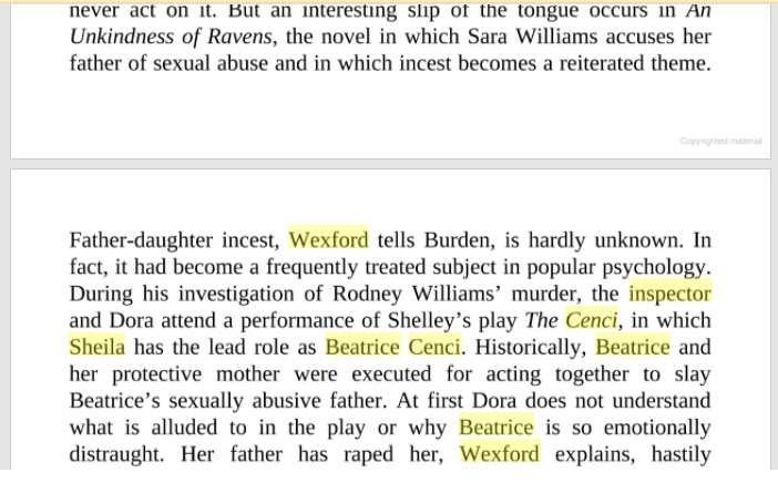 Percy Bysshe Shelley wrote The Cenci in 1819. Shelia Wexford is an actress who is playing Beatrice Cenci in the play. I have Beatrice’s Spell right here beside me to investigate the link with Guerra.