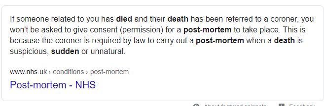 We had no choice. It’s the LAW here that any sudden unexplained death is immediately referred to the coroner for a POST-MORTEM not the US word Autopsy (?)