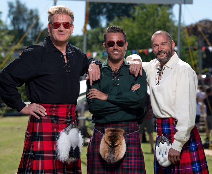 Be still my beating heart. Gino d’Acampo cooks and sings and plays guitar? And has a great sense of humour. Three men and a Beaver/Sporran ?
