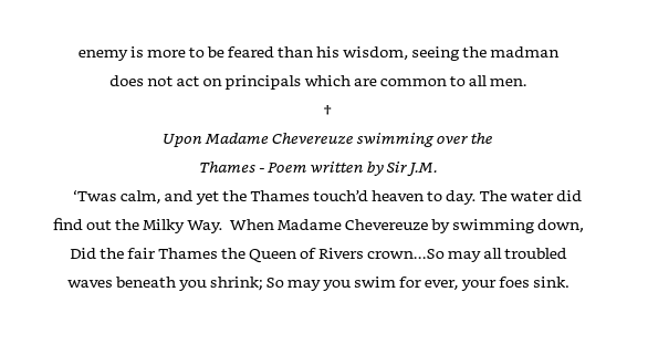 Anyway. Whilst staying there, and within a few days of giving birth to Henry Rich’s daughter (done that,) Marie swam across the Thames and back from the wharf at Somerset/Denmark House. Scandalising all the French Prelates who had accompanied Henriette Marie to England. They wrote a barrage of #disgusted letters to Richelieu telling him about Marie’s behaviour – at the same time as English Poets wrote admiringly about her antics.